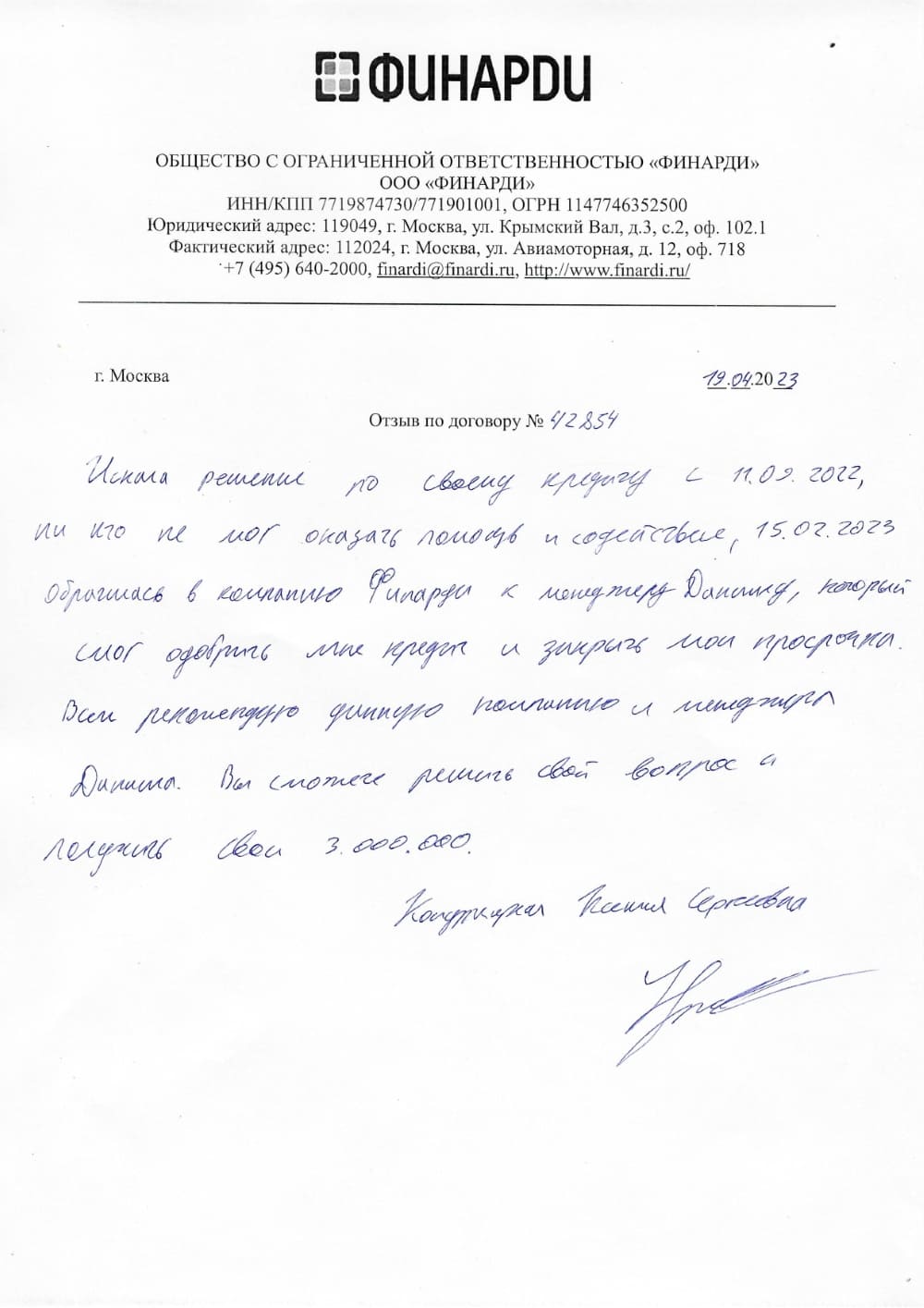 Всем рекомендую данную компаниюИскала решение по своему кредиту с 11.09.22, никто не мог оказать помощь и содействие, 15.02.23 обратилась в компанию «Финарди» к менеджеру Даниилу, который смог одобрить мне кредит и закрыть мои просрочки. Всем рекомендую данную компанию и менеджера Даниила. Вы сможете решить свой вопрос и получить свои 3 млн.