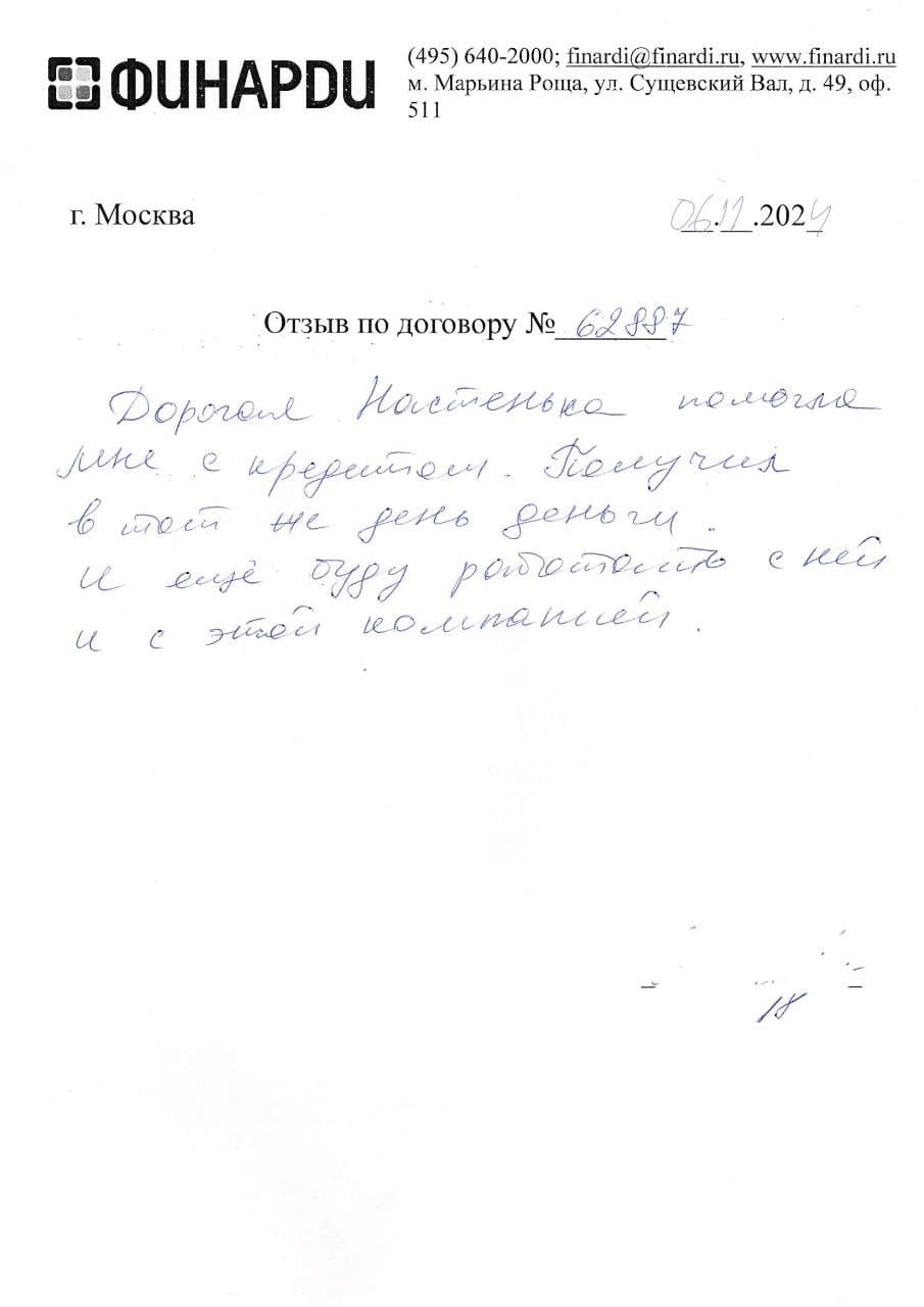 Дорогая Настенька помогла мне с кредитом. Получил в тот же день деньги. И ещё буду работать с ней и с этой компанией.