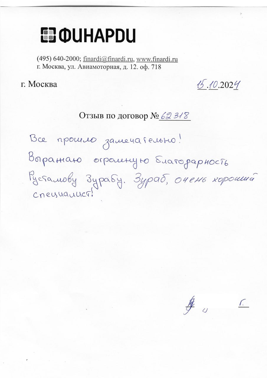 Отличная работа, благодарю!Все прошло замечательно! Выражаю огромную благодарность Рустамову Зурабу. Зураб — очень хороший специалист!