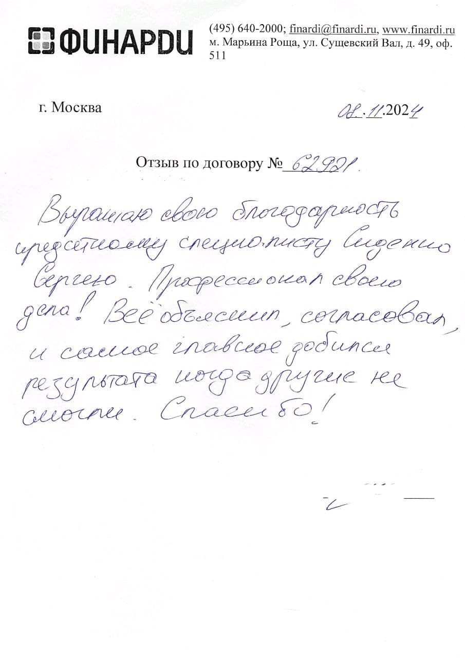 Компетентно выполнена работаНесмотря на мое скептическое отношение к посреднической работе, я была очень удивлена тому, как компетентно была выполнена работа Сергея! Благодарю за помощь «Финарди».